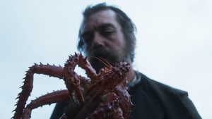 Ya en la película, tuve paz. La historia de Alessio Rigo de Righi y Matteo Zoppis me envolvió completamente. Si hay palabra que la resuma es cuento. Un cuento magnífico. De hecho en la propia película se reúnen cazadores a contar historias y de su memoria surge esta aventura. El protagonista, borracho, solitario y algo misántropo, me recordó estéticamente a H. D. Thoreau con esas barbas. Pensé en dejármela igual, con aires de decadencia y filosofía. Reconozco que, como director de cine, no soy el más docto en el mundillo pero juraría que entre la dirección o guionistas existe un fan de ESDLA: Esa escena de apertura, oro brillando en el fondo de un lago y una mano que se acerca y lo rescata… ¿No empieza así la historia del resurgir del anillo que filmó Peter Jackson? O aquella otra escena, cerca del final, en la que se encuentra una figura tendida en la ladera de una colina volcánica… ¿No lanza un guiño al plano del final de la trilogía de Tolkien con los hobbits rendidos sobre el Monte del Destino? En cualquier caso, las escenas de The tale of King Crab son muy poderosas, a favor de la geografía salvaje y la decadencia humana (pueblo en ruinas, barco naufragado, etc.). Otro motivo por el que me recuerda a un cuento es el uso del propio cangrejo como brújula y guía. Recuerdo haber leído esto mismo, protagonizado por la tortuga Casiopea, en la famosa novela Momo de Michael Ende.