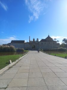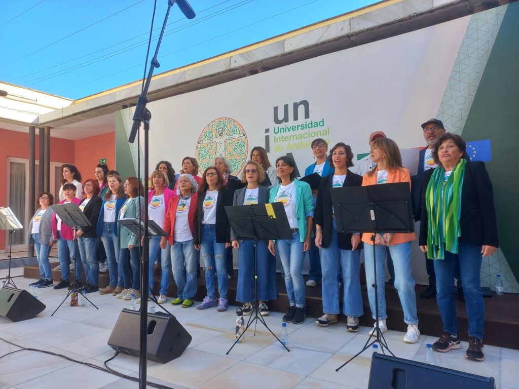 El antiguo Monasterio de La Cartuja está situado a las afueras de la ciudad, donde el silencio reina y pude disfrutar de un sol otoñal que invitaba al paseo. Aquel edificio, que recoge el Centro de Arte Contemporáneo y la sede de la Universidad Internacional de Andalucia (UNIA), me parecía anclado en otro tiempo. Igual paseé por aquí en el siglo de su fundación, que creo recordar que fue el XIV, aunque todo estaría más bien lleno de capillitas. Ahora el panorama era otro cantar, nunca mejor dicho. Un patio interior, abierto a un sol tímido, estaba dispuesto con un gran número de sillas frente a un escenario. A un extremo del mismo, ya habían desplegado una batería Gretsch y un piano Kawai, al que se sumaría un bajo eléctrico Warwick. ¿Qué quieres? Pillé asiento en primera fila, impaciente, había llegado con antelación, impaciente, empecé a observar cada detalle, IMPACIENTE. Cuando el público se asentó desfilaron las veintitrés coralistas, dos de ellos hombres-gorra (los llamaré así, me pareció curioso que, para dos hombres que había en el coro, ambos las llevasen). La directora, Natalia Ruciero, era todo entusiasmo y cachondeito, lo cual agradecí profundamente, y nos condujo por un resumen de su biografía a través de sus canciones. Sonaron tan bien, me hipnotizaron tanto, que apenas me dio tiempo a molestar… Un lapsus de canción por aquí, un crepitar del bajo en la primera canción, una cáscara de plátano en el suelo para que saliese en todas las fotos del coro… Poca cosa, la verdad. Hacía una mañana perfecta y tras el concierto busqué algo gratis de beber en el bar de allí y me quedé tumbado en el césped hasta que tuve que moverme para cumplir con las propuestas del Festival.