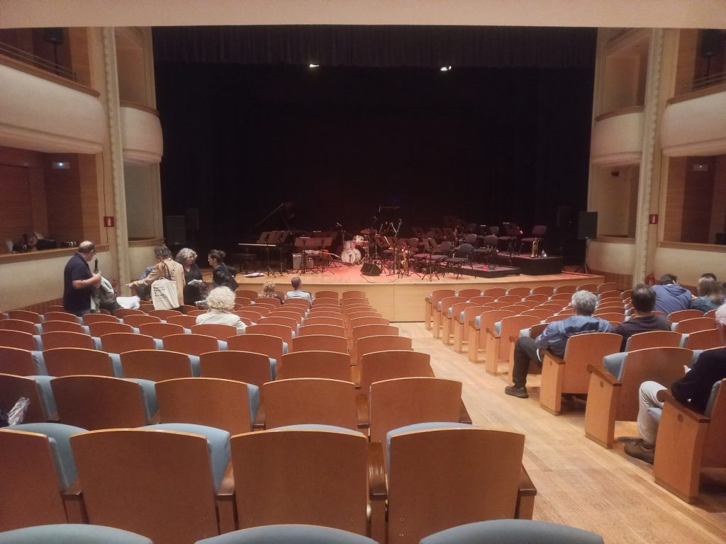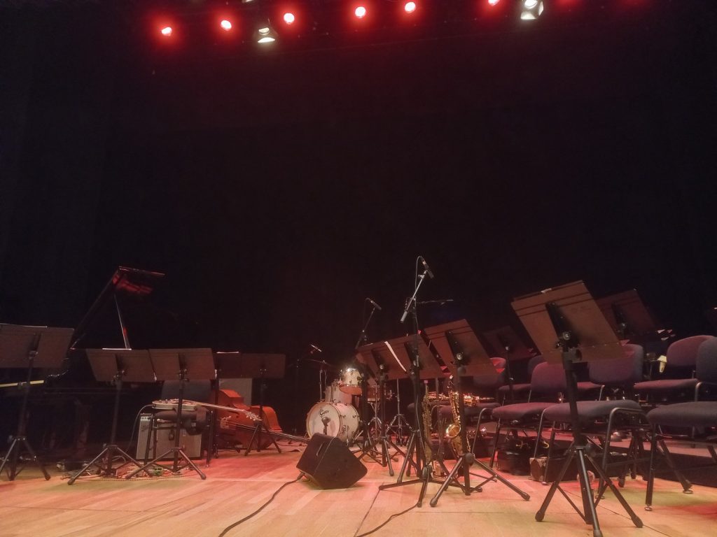 Hice que se encendieran los focos con luz roja (atención, peligro) y reveló sobre el escenario un piano, un contrabajo, amplificador para guitarra, batería y tres filas de atriles y asientos, dispuestos en gradas, para la sección de viento. Conté rápidamente los reposanalgas y estimé diecisiete culos de talentosos músicos. Esto ya me encendió el nivel de alerta mental, avisos de maremoto ansioso, así que inicié una serie de respiraciones y gorgoteos que me han enseñado mis plumíferas psicólogas. Pero fue todo un reto porque el público fue conquistando el aforo y pronto el oxígeno del auditorio estaba bastante repartido, o esos sentía yo.