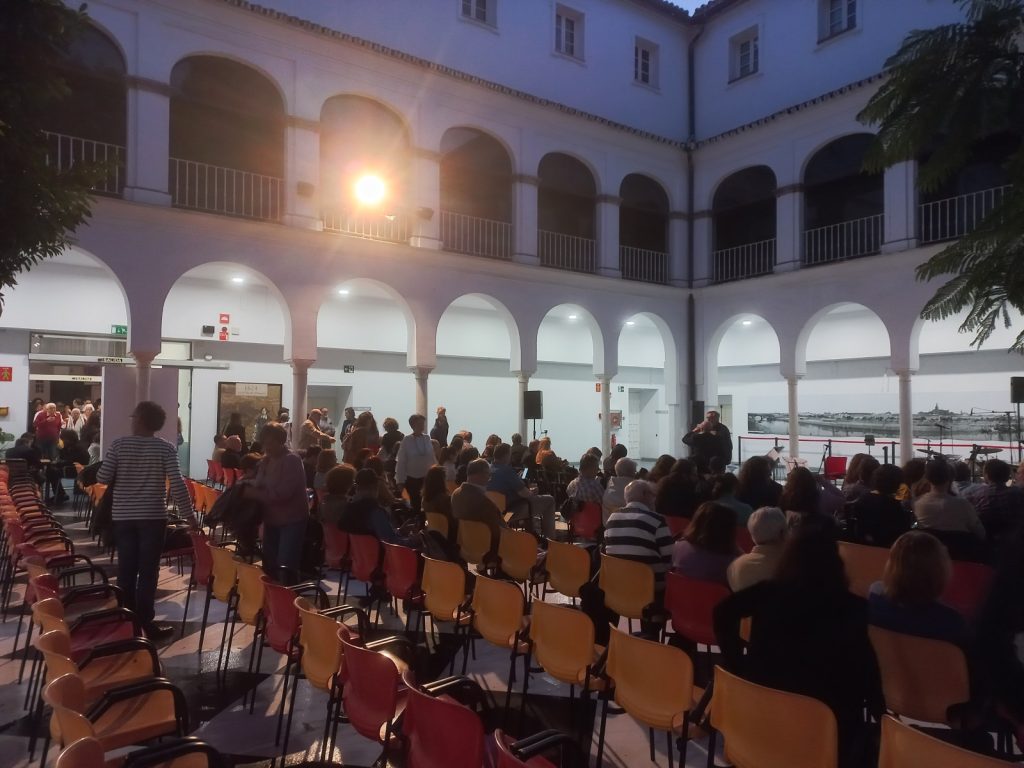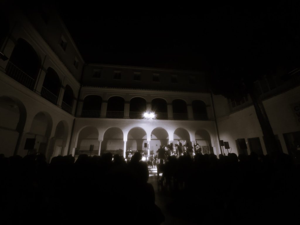 Todo se llenó, en apenas diez minutos, de espectadores y botellines que vendían en la cafetería dispuesta en el propio patio. Cuando llegaron los músicos de la ASSEJAZZ BIG BAND, el eco de los aplausos resonaban como un sonajero, pero ellos fueron a lo suyo, lo suficientemente nerviosos o profesionales para no estirar una sonrisa cómplice antes de empezar. Y se abrió la caja de ritmos, a cielo abierto, bajo un tapiz ya oscurecido, por el que se regaló música para los astros. Yo me eché sobre el respaldo, divorcié mi barbilla del fular, y disfruté del sonido que emitían sus instrumentos con trabajada facilidad mientras observaba los destellos ahí arriba. Sin duda, ese espacio abierto fue lo que evitó que se acelerara mi pulso y flaqueza, como bien saben mis lectores y psicólogas, y toleré sin ápice de ansiedad tanto acompañamiento dentro y fuera del improvisado escenario.
