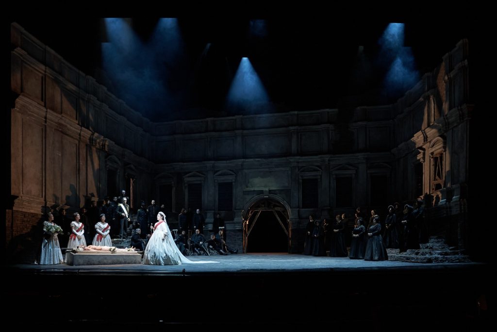 Se elevó el telón y bajo una luz azul apareció un decorado descomunal que simulaba un patio semiderruido entre edificios y, en aquel especio, mujeres de negro, limpiando a un caído en combate. Pensé en la coincidencia olímpica de que mi primera visita al Teatro de la Maestranza como eidôlon tuviera una primera escena centrada en un muerto. Maravilloso. La primera parte de la obra fue intensa, plantean la historia y las dificultades en las que se encuentran, y es muy importante siempre destacar el gran papel de heroína que tiene el personaje de Norma, que aboga por la resistencia pacifista en una situación de invasión militar, con visión protectora de su pueblo y mesura para el ánimo de guerra. Pero pronto eso cambiará: El mismo amor que ata su control es el que prende razones para la venganza. Norma, presa de una dicotomía emocional y contradictoria, deberá resolver su interior mientras lidera a su pueblo. ¿Presión? Ninguna, ninguna… Pero atención a la espada que empuña y que sólo ella puede manipular (símbolo de su voluntad), que como toda arma, está capacitada para la defensa y el ataque. Esta sacerdotisa tiene mucho en común con Casandra, ahora lo veo claro. El talento vocal de los intérpretes es sublime, apoyado en momentos graves de un coro multitudinario que se mimetizan con la imagen de creyentes y soldados tullidos. Y es que el vestuario, diseñado por Valeria Donata Bettella, es de una elegancia austera que pivota entre la discreción y el acento protagonista.