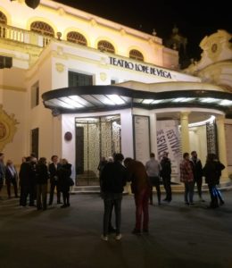 Aplausos de bienvenida, presentación de la película por Rodrigo, su coguionista David Safier y la niña actriz Dalit Streett Tejeda. Nos la vendieron muy bien, la verdad sea dicha. Y no faltaron a la verdad. Una película sobre actores que desarrollan una obra para escapar mentalmente del gueto en el que se encuentran (Polonia, 1942) me pareció idónea para verla allí, precisamente en un teatro magnífico como es el Teatro Lope de Vega. Más si quien la ve, además, es un actor vocacional como soy yo mismo. Debo confesar que en la película dejé de lado a Fran Manuel, el fotorreportero, y la viví como Víctor Vigía, sin mayor condimento. Me entusiasmaron especialmente los planos secuencias y las canciones. Una obra con mucha luz enmarcada en la agria historia que todos tenemos en mente y que, por lo tanto, no pretendió  mostrar en abundancia ni bajo orden moral alguno. Una relato  basado en hechos reales.