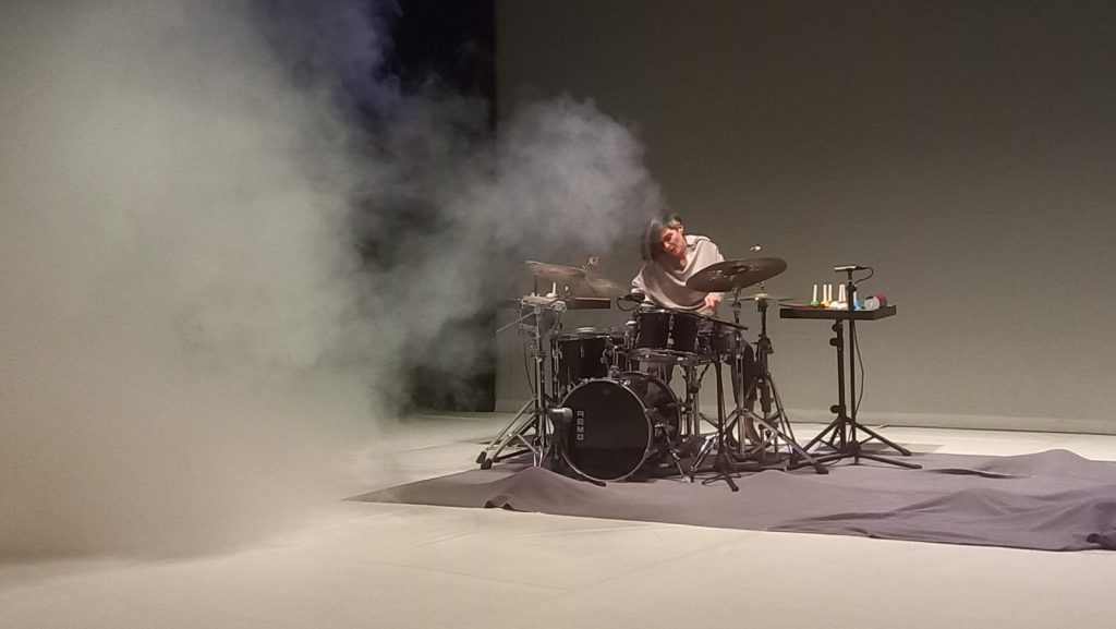 En aquella sala no existía la numeración de asientos, pequeña tendencia a la entropía, agraciada por el tamaño menor del habitáculo. Por ello el público no se entretuvo con cafés o vasos fríos de dudosa moral, muy al contrario, formaron cola en la base de la escalera que les llevaría a la primera planta y la sala en cuestión. Todo muy civilizado. Yo entré de los últimos, un eidôlon no se plantea angustia alguna por pillar buen asiento. Por lo general, al ser un fantasma, no me canso especialmente, mis piernas siempre están igual de mal (inconveniente de haberme transfigurado en espíritu con avanzada edad). No obstante, si quisiera darme un lujo y reposar mis dramatúrgicas nalgas, lo suelo hacer donde me plazca, si acaso primerísima fila, aunque ya esté ocupado el asiento, con todo el repelús que supone para quien ya estaba allí y sufre este atravesamiento espiritual. Una vez dentro y posicionados, las luces se apagaron por completo. Un bebé lloraba medio dormido en brazos de su madre y aclaro que no era parte del show pero casi se mimetizaba con la abstracción pretendida desde el inicio. Tras aparecer cercados en un haz de luz y generar una serie de movimientos agarrotados, Lucía Martínez se dirigió a la batería, rodeada de «juguetes sonoros», a fin de explorar percusiones muy particulares, y comenzó a generar una atmósfera iniciática.