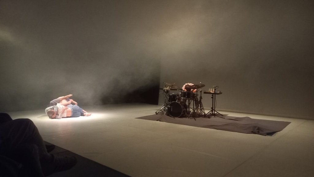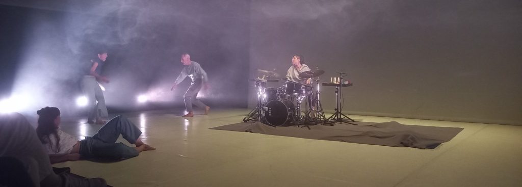 En el fragor más intenso de la batería, más propio de la música metal, los cuerpos fueron arrojándose entre ellos a un extremo del escenario mientras convulsionaban, y corrían lejos, para volver al rompeolas. En un momento determinado, la fricción de cuerpos hizo que el espacio se llenase de humo blanco, un limbo generado en el fragor de aquella comunicación no verbal. La batería fue la única visión entre aquella niebla durante unos minutos, inclemente con el pulso de la escena, hasta que se consiguió una de las imágenes más emotivas de la noche, aquella interacción entre cuerpos conformó algo que yo llamaré el «nudo-roca» de sus cuerpos, un abrazo múltiple, arropados contra el suelo, cuyas extremidades van rodeando y buscando a los otros en forma de amasijo delicado, con la decisión de que ninguno de ellos se perdiese en la deriva emocional por la que eran proyectados. En el tramo final, los bailarines repetirán patrones de movimiento que establecieron al inicio, originando un cierre circular o, más bien, un milagroso reinicio en el que, una vez obtenida aquella «geometría de la experiencia», consiguen desarrollarse sin caer en los mismos abismos emocionales. Yo no sé bailar, tampoco soy un experto observador de esta rama escénica, pero me consta una evidencia: Los cuatro se salieron de sí mismos para ofrecernos una conexión más allá del ego y las palabras.