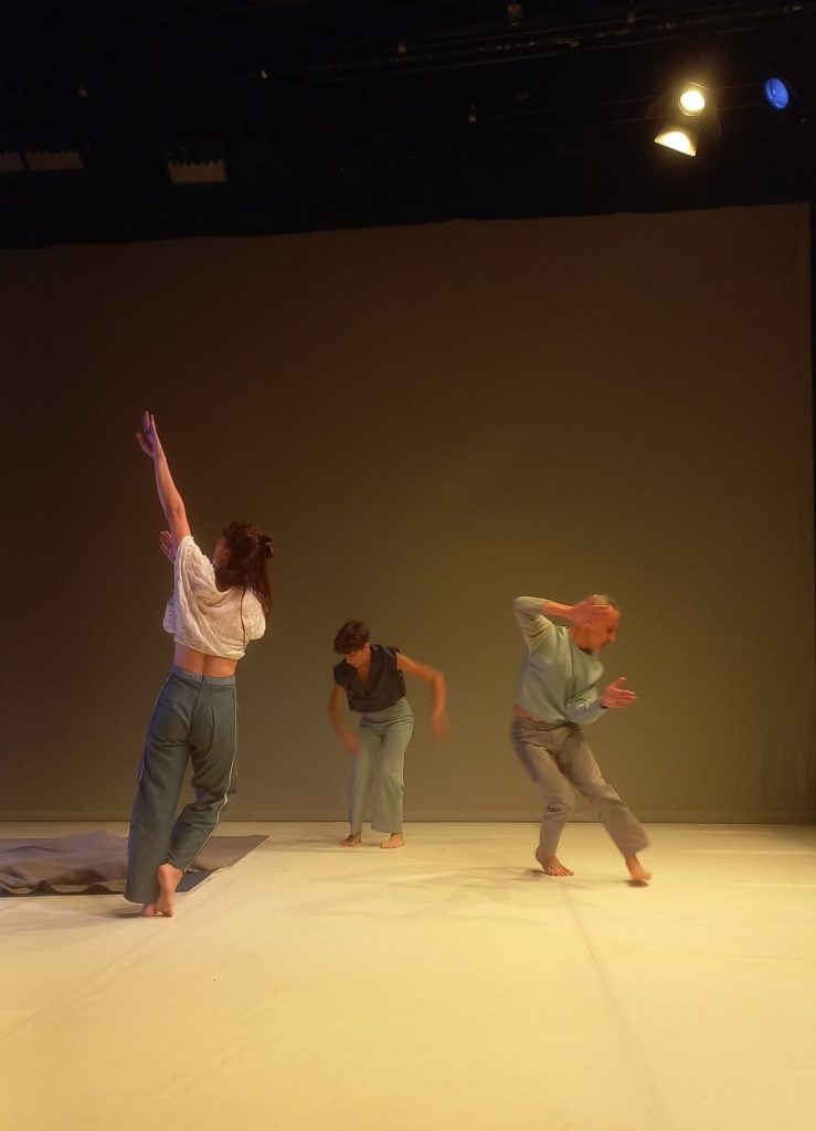 Debo reconocer que siempre es difícil recoger con palabras el movimiento vivo de la danza, así que optaré por recoger mi impresión de su esencia, lo que transmitía aquella música en comunión dialogante con los cuerpos. Arrancó el espectáculo de forma minimalista, con bailes angulosos, casi fotogramas de actividades más cercanas al yoga o al atletismo, en cualquier caso, estaban contenidos en sus movimientos. Pude apreciar la selección cromática de las prendas de los bailarines, desde la que aquel trío parecía angular sobre la figura de Natalia Jiménez, puesto que ella tenía los colores de ambos (pantalones verde agua con detalles grises, como la chaqueta y pantalón de Víctor Zambrana, chaqueta azul y camisa blanca, como la vestimenta de Anna Katalin Nemeth). Desde luego esa era la conexión, pero entre ellos interactuaban con la sorpresa y atracción con la que podrían hacerlo elementos químicos a nivel atómico.