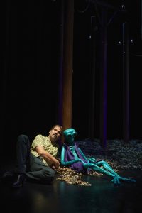 Luces fuera, la sala estaba llena y vibrante, aparecen en escena, caminando entre los troncos, apenas guiados con una linterna, dos hombres que han sobrevivido a un accidente de coche y que buscan el motivo que les distrajo de la carretera. La temática alienígena es una excusa para hablar precisamente de aquello que nos hace humanos, en concreto, las maneras que existen de mantener, fortalecer o perder relaciones. Aplaudí el esfuerzo por conducir todo desde el humor, algo distante, de estos protagonistas (a los que se le sumaría una actriz desde mitad de la obra), entre los que surgirán encontronazos de los que se desprenden lascas del drama que cada uno de ellos porta.