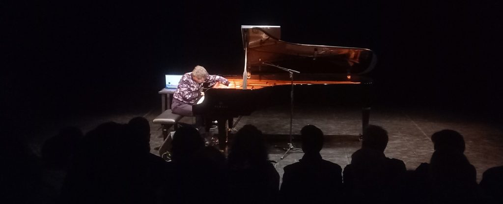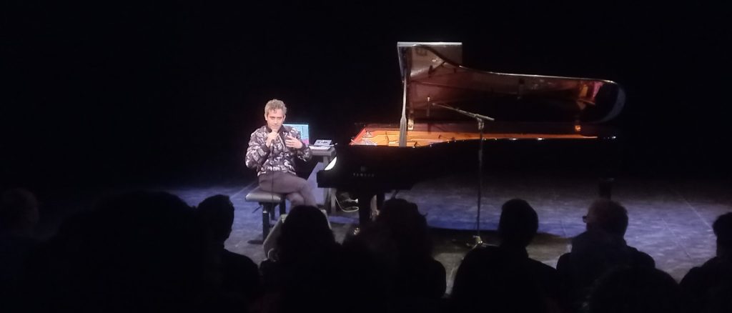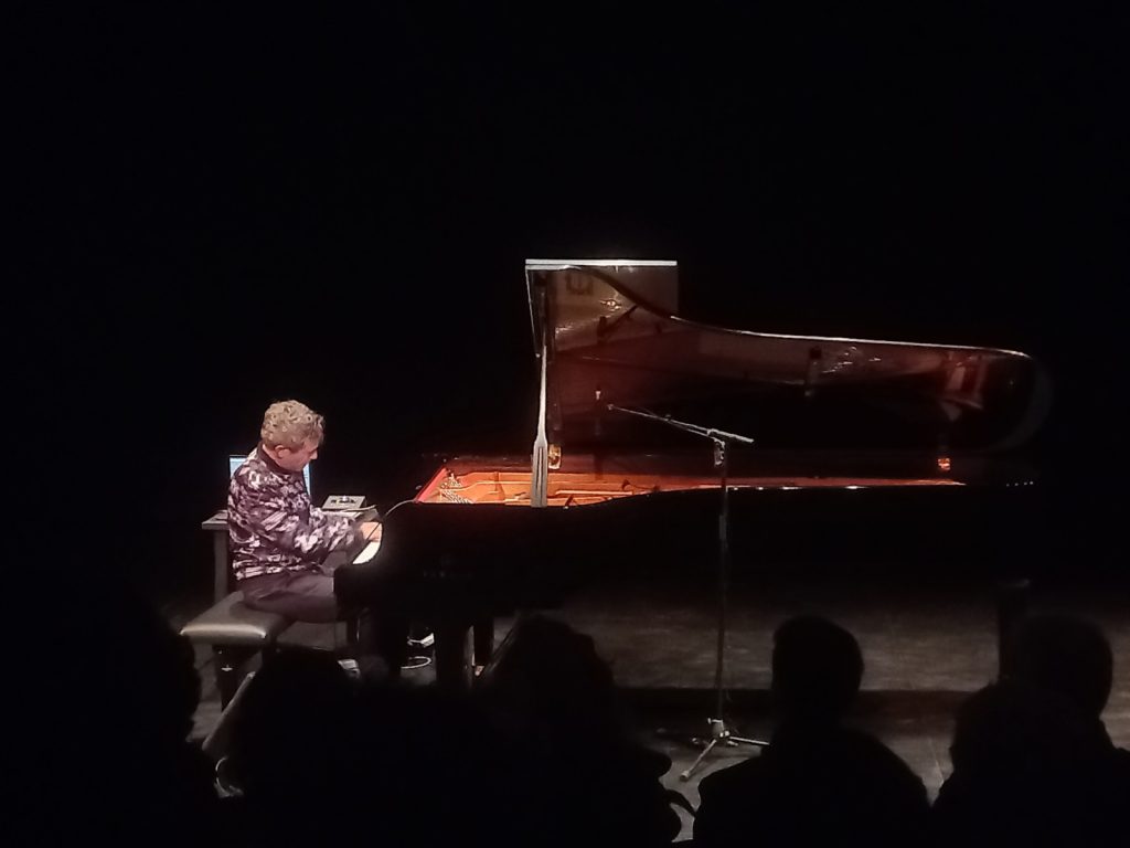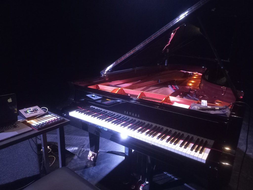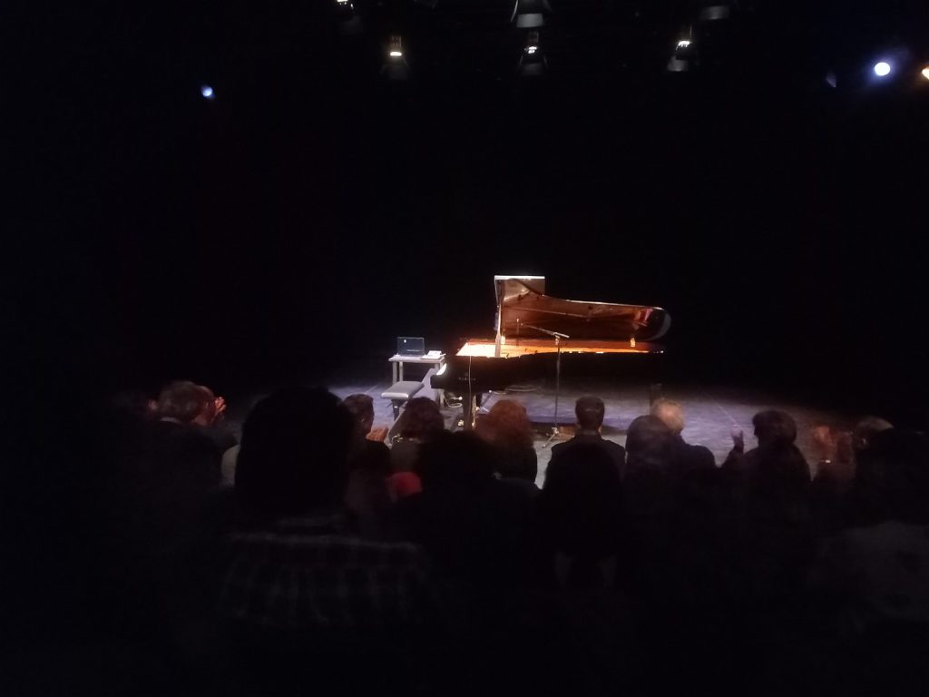 Cuando llegó la hora, todos subieron las escaleras para mi sorpresa, ¿a dónde iban estas almas ansiosas de cerrar el ciclo de jazz de este noviembre? Pues te mato la duda: A la Sala B, un espacio más pequeño y acogedor, donde tendría lugar la actuación de aquella noche. Nuevo como era por estas coordenadas del espacio-tiempo, aquello supuso una alegría. Tenía mucho Teatro Central por descubrir. Conforme a la dinámica de cuerpos, diría que en aquella sala no hay espacios numerados, la gente se buscó la vida y, como frente a una pequeña grada, había un piano de cola, muchos decidieron instalarse allá donde pudieran controlar las manos del intérprete. Por mi parte, al entrar me dirigí directamente al piano, pude comprobar que estaba acompañado de una mesita auxiliar con un portátil y una máquina que sería incapaz de explicar, supongo que guardaría algunos efectos sonoros. Allí comprobé que había documentos a nombre de JOSÉ CARRA con un subtítulo que decía «El arte de la improvisación». ¡Opa, mi vida es eso!