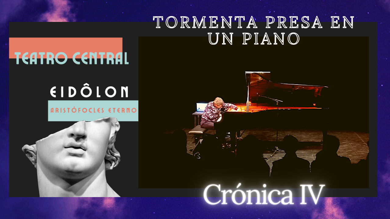 El sumun fue doble: En primer lugar, cuando metió la mano en la boca abierta de su piano para asordinar sus pulsaciones y generar un desgarro de juguete roto. La otra fue, sin duda, la grabación de una mujer que cantó mientras lloraba aquella canción de «Over the Rainbow», que fue incluida como tema en aquellas teclas blancas y negras, quizás más negras que nunca. La tormenta perfecta. El concierto terminó y el selecto público aplaudió mecido aún entre el sobrecogimiento y la satisfacción, habíamos sobrevivido a la tormenta perfecta de Carra. Bueno, ellos, yo no he sobrevivido mucho siendo un ediôlon, pero ya me entiendes.