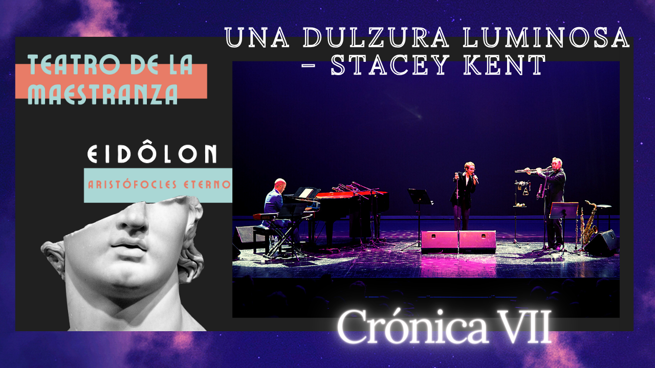 Entonces pude reconocer el escenario del TEATRO DE LA MAESTRANZA de Sevilla, me hizo gracia la continuidad de auditorio, pero rápidamente me apresó un sentimiento de extrañeza. El escenario era diferente y, a su vez, el mismo, ¿cuál era la disonancia? Tardé en verla, luego pareció evidente: Su área era más pequeña porque habían bajado un telón en el fondo para disponerlo de forma más íntima (e imagino que para proteger la escenografía elaborada de la ópera Norma de Bellini, que seguiría interpretándose los días venideros, si mis cálculos no fallaban). Bajo la luz púrpura de los focos, habían dispuesto un piano de cola, un teclado, al menos tres micrófonos con su pie, instrumentos de viento como saxos y flautas, y algunas percusiones de pequeño tamaño. Por la disposición suponía que presenciaríamos un trío musical, la gente entró con prisas pero no les veía con folletos publicitarios en las manos, por lo que tuve que ir hasta el piano y ver en un apunte rápido sobre el piano, una hoja con notas manuscritas bajo la fecha del 13 de noviembre, y, en la parte superior, se titulaba STACEY KENT con el subtítulo de Songs from other places, que era el disco que venían anunciando en esta gira, deduje. Pero me sorprendió ver a tinta azul una flecha que salía de ese nombre y señalaba otra frase subrayada que decía «Summer me, Winter me: New album, worldwide release Nov 10th 2023!».